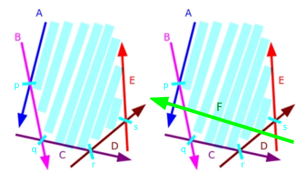 فرض کنید $H = \{ A, B, C, D, E \}$ مجموعه نیمصفحههایی باشد که در حال حاضر در اشتراک وجود دارند. علاوه بر این، فرض کنید $P = \{ p, q, r, s \}$ مجموعه نقاط تقاطع نیمصفحههای مجاور در H باشد. حال، فرض کنید میخواهیم آن را با نیمصفحه $F$ قطع دهیم، همانطور که در تصویر زیر دیده میشود: