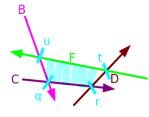 توجه کنید که نیمصفحه $F$ باعث میشود $A$ و $E$ در اشتراک زائد شوند. بنابراین ما هم $A$ و هم $E$ را به ترتیب از ابتدا و انتهای اشتراک حذف کرده و $F$ را در انتها اضافه میکنیم. و در نهایت اشتراک جدید $H = \{ B, C, D, F\}$ با $P = \{ q, r, t, u \}$ را به دست میآوریم.
