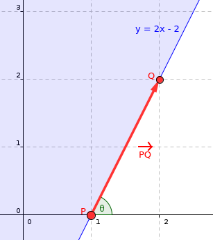نیمصفحه $y \geq 2x - 2$ را میتوان با نقطه $P = (1, 0)$ و بردار جهت $PQ = Q - P = (1, 2)$ نمایش داد.